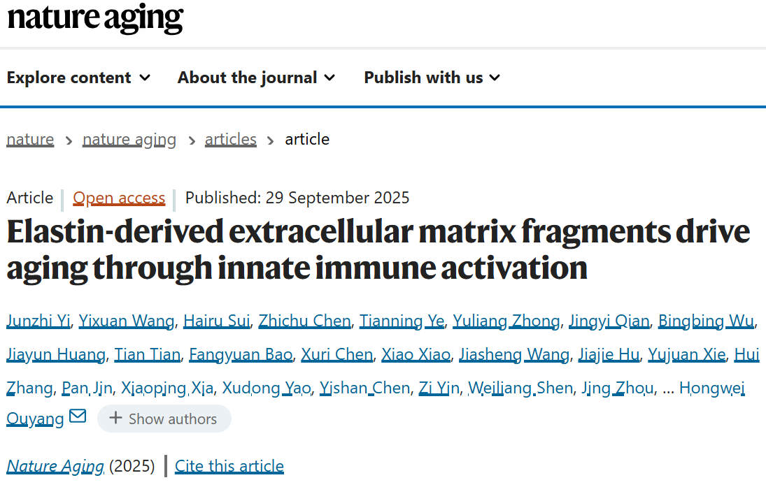 Nat Aging | 良渚实验室欧阳宏伟团队揭示弹性蛋白降解片段进入血液导致机体慢性炎症性衰老