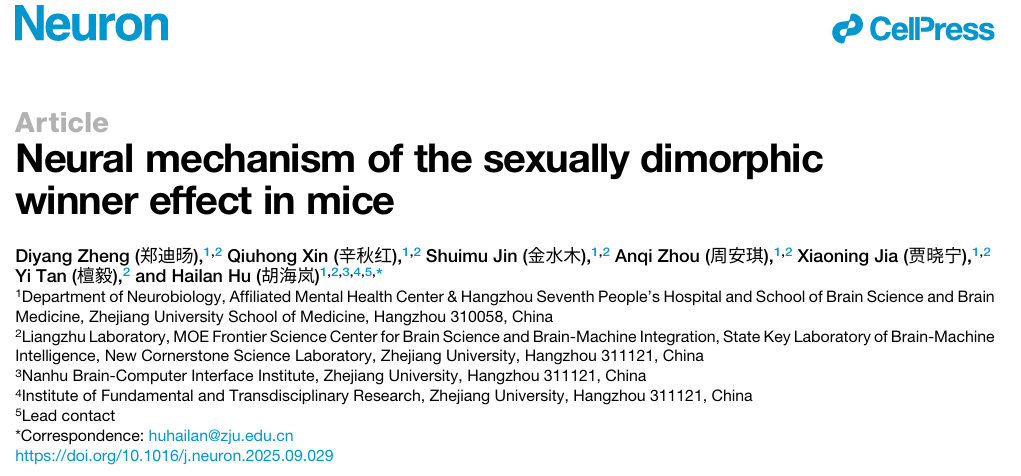 《Neuron》| 良渚实验室胡海岚团队解码“胜者效应”性别差异:雌性竞争行为展现独特模式